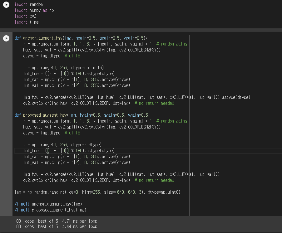 remove datatype conversion process that can be skipped. import random import numpy as np import cv2 import time def anchor_augment_hsv(img, hgain=0.5, sgain=0.5, vgain=0.5): r = np.random.unif...
