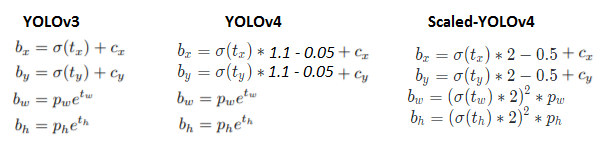 bx와 by는 YOLOv4 페이퍼에서 언급됐듯이 grid sensitivity 를 고려하여 수정된 것인데... bw와 bh가 왜 저렇게 바뀐지 이유는 못찾았다. YOLOv5 도 Scaled-YOLOv4 의 수식을 따라가는듯하다. 알고보니 Scaled-YOLOv4 가 YOLOv5를 따른 것...