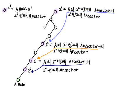 "i 번 노드의 2^j 번째 Ancestor 노드"는 "i번 노드의 2^(j-1) 번째 Ancestor 노드의 2^(j-1) 번째 Ancestor 노드"입니다.