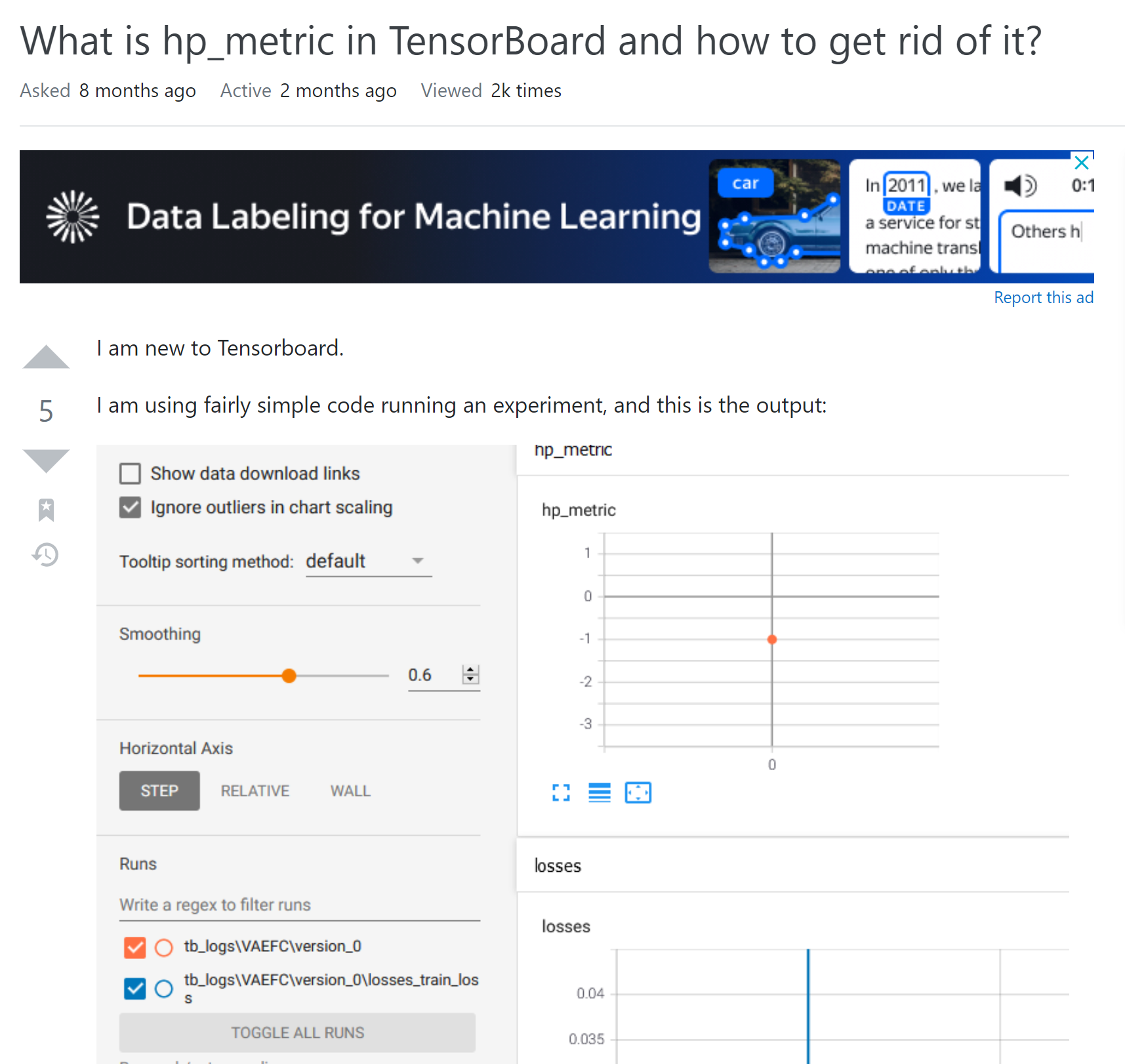 I am new to Tensorboard. I am using fairly simple code running an experiment, and this is the output: I don't remember asking for a hp_metric graph, yet here it is. What is it and how do I get rid...