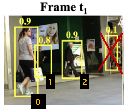 t1 시각에 취득된 프레임부터 트래킹을 시작하겠다고 가정하겠다. 먼저 해당 프레임을 Detection Model에 넣고 객체를 검출한다. 검출된 객체 중 Confidence Score(이미지 상에서 노란 박스위에 있는 숫자)가 낮은 객체를 필터링한다. 여기서는 Confidence Score가 0.5 보다 낮은 바운딩 박스들은 Background로 간주한다. 엄밀한 정의는 아니지만 일단 Confidence Score를 해당 객체가 사람일 확률로 생각해보자.