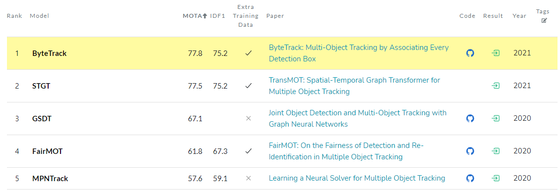 트래킹 알고리즘을 개발할 일이 있어서 최근 SOTA 성능을 보이는 트래킹 방법을 서칭해보았다. 멀티플 오브젝트 트래킹 알고리즘의 성능평가를 위해 사용되는 벤치마크 데이터셋인 MOT17, MOT20 데이터셋에서 어떠한 방법이 SOTA 를 달성했나보니 ByteTrack 이란 방법이 SOTA를 달성한 것을 확인했다. (2021년 12월 24일 기준)