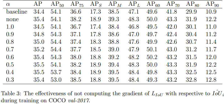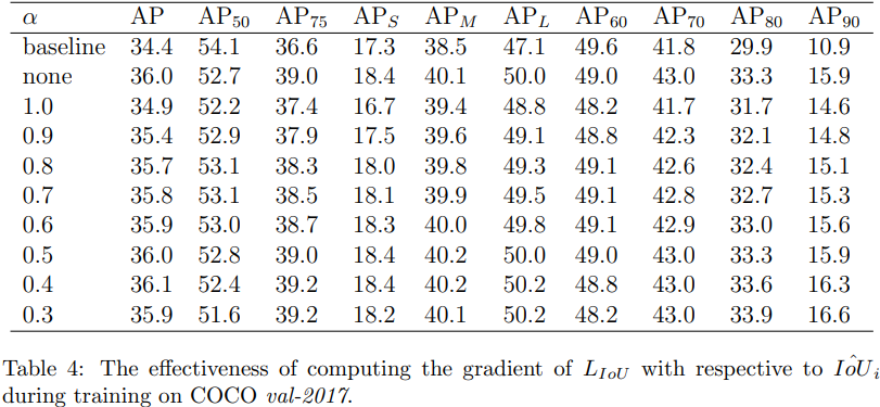 Table 4는 IoU Loss를 \(\hat{IoU_{i}}\) 으로 미분한 Gradient를 계산하여 모델을 학습시켰을때, \(\alpha\) 값에 따른 AP를 기록한 표이다. Table 3는 IoU Loss를 \(\hat{IoU_{i}}\) 으로 미분한 Gradient를 계산하지 않고 모델을 학습시켰을때의 결과이다. Table 3과 Table 4를 비교해보면 Table 4의 AP가 대체로 높은 것을 확인할 수 있다.