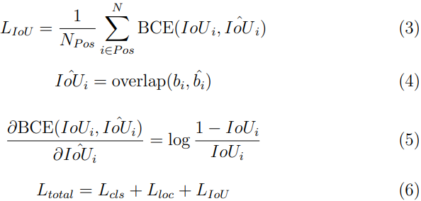 이 IoU Prediction 헤드를 학습시키기 위해 사용한 Loss는 BCE(Binary cross-entropy loss)를 사용했다. Ground Truth는 학습과정에서 예측한 바운딩박스와 이 바운딩박스의 Ground Truth 대상이되는 바운딩박스간의 IoU이다.