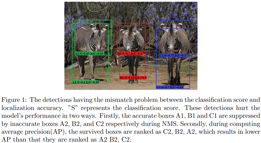 위 그림을 보면 모델이 예측한 6개의 바운딩 박스(A1, A2, B1, B2, C1, C2)가 있다. 위 바운딩 박스들을 보면 Localization이 잘된 박스는 A1, B1, C1 이다. 그런데, 위 바운딩 박스들은 Class score 기반의 NMS(Non-maximum suppression)를 거치면 Localization accuracy가 낮지만 Class score(=S)가 높은 A2, B2, C2 박스가 최종적으로 남고 A1, B1, C1 박스는 제거된다. 이 박스들로 AP(Average Precision)을 측정하면 TP와 FP를 판가름하는 IoU Threshold 값이 높아질수록 Detector의 성능은 낮게 나올 것이다.