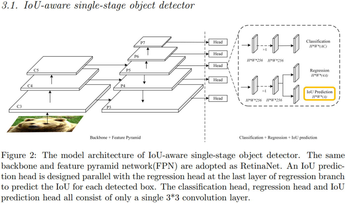 위 그림에서 IoU Prediction 헤드를 제외하고는 기존에 제안되어온 여타 FPN(Feature pyramid network)기반 Object Detectors와 모델 구조가 크게 다른 부분이 없다. 저 IoU Prediction 헤드가 바로 Localization accuracy를 예측하기 위한 헤드이다. 참고로 RetinaNet을 베이스로하여 저 IoU Prediction 헤드를 추가했다고 한다.