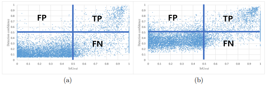 위 그림은 예측한 바운딩 박스 10,000개를 샘플링하고 이 박스들과 Ground Truth 박스대비 \(IoU_{eval}\) 대비 Detection confidence를 산점도(Scatter plot)로 나타낸 그림이다. 여기서, 여기서, \(IoU_{eval}\) 은 예측한 박스와 클래스가 일치하면서 가장 높은 IoU를 갖는 Ground Truth 박스간 IoU를 의미한다. \(IoU_{truth}\)와 차이를 이해하는 것이 중요하다. 잘 이해가 안된다면 논문의 Fig 5. 를 보면 된다. (a), (b), (c)는 Class score로 Detection confidence를 매겼을때의 결과이고, (b)는 Predicted localization accuracy도 추가적으로 이용했을때의 결과, (c)는 Ground truth localization accuracy를 이용했을때의 결과이다. 이상적인 결과는 \(IoU_{eval}\)과 Detection confidence가 선형적인 관계를 이루는 것이라고 생각된다. 이러한 관점에서 그림 (a)와 (b)를 보았을때, Localization accuracy를 Detection confidence에 반영해주었을때... 어떻게 좋게 잘 해석이 안된다. 대체로 Detection confidence가 상승한 점이 명확히 보인다. 실제로 배포시에는 특정 Detection confidence threshold를 정의하고 이보다 낮은 박스들을 무시한다. 대개 이 값을 0.5로 설정하고 TP, FP여부에 대한 판단을 위한 IoU Threshold를 0.5로 정의한다고 했을때, 그래프를 사분면으로 나누어 포인트들의 FP, TP, FN 여부를 아래 처럼 분류할 수 있을 거 같다. 흠... 이렇게만 보면 제안하는 방법을 사용했을때 Detection confidence에 대한 튜닝없이는 오히려 FP수가 증가된 것으로 해석된다.