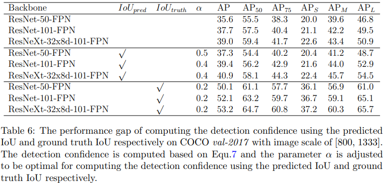 Table 6는 예측한 IoU대신에 실제 Ground Truth 박스간 IoU(=\(IoU_{truth}\))를 사용하여 Confidence Score를 사용했을때의 결과이다. IoU가 정말로 잘 예측이 된다면 성능이 어마어마하게 올라갈 수 있다는 것을 의미하며, 한편으로는 예측된 IoU의 정확도가 크게 낮다는 것으로도 해석할 수 있다. 여기서, \(IoU_{truth}\) 는 예측한 박스와 가장 높은 IoU를 갖는 Ground Truth 박스간 IoU를 의미한다. 원래 AP 측정할때 True Postive로 판단되려면 IoU가 특정 쓰레스홀드보다 높으면서 클래스도 일치해야하는데 \(IoU_{truth}\)는 클래스를 고려하지 않고 측정된 값이다.