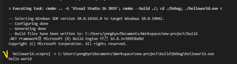 "command": "cmake .. -G 'Visual Studio 16 2019'; cmake --build ./; cd ./Debug; ./helloworld.exe",
