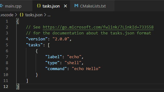 일단 echo를 선택하고 엔터를 눌러보자. tasks.json의 내용이 일부 변경된걸 확인할 수 있다.