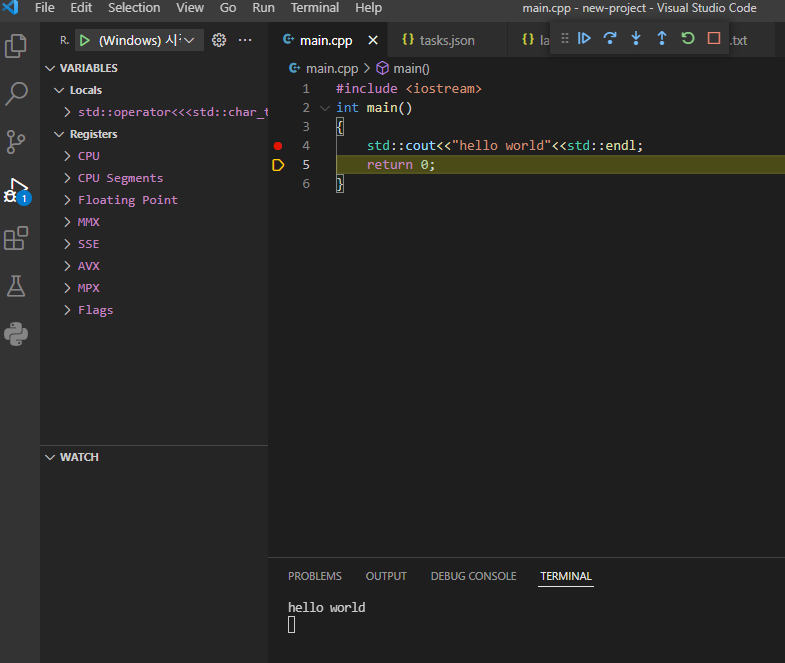 이렇게 설정을하고나서 ctrl+shift+b 를 눌러보면 hello world가 출력되는 것을 확인할 수 있다.