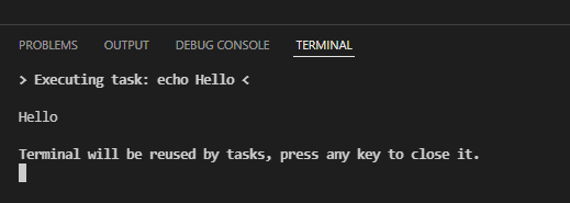 명령어창에 Hello가 나온걸 확인할 수 있는데 바로 "echo"란 task를 실행해서 "echo Hello"라는 "command"를 자동으로 실행됐기 때문이다.
