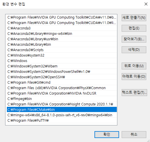 근데 이걸 먼저 깔았는지 CMake를 따로 https://cmake.org/download/ 이 링크를 통해 설치했는지 기억이 잘안난다... 하여튼 CMake를 설치하고 환경변수에 cmake.exe 가 위치한 곳의 경로를 입력해두자... 저거 없어도 될 거 같기도한데... 오늘보니 과거의 내가 깔아뒀길래 일단 언급해둠.