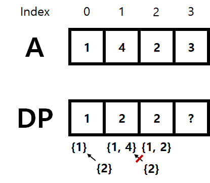 그림에서 DP 란 Table 이 추가 되었습니다. DP[i] 의 의미는 A[:i+1] 의 원소들로 만들 수 있는 A[i] 를 포함하는 가장 긴 증가하는 부분 수열의 크기를 의미합니다. DP Table 밑에 존재하는 집합은 A[:i+1] 의 원소들로 만들 수 있는 A[i] 를 포함하는 가장 긴 증가하는 부분 수열을 나타냅니다. 해당 문제에서 가장 긴 증가하는 부분 수열의 원소들을 출력할 필요는 없으나 문제 설명을 돕기 위해 첨부하였습니다.