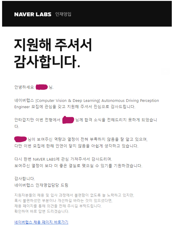 전문연구요원으로 복무한지 1년 6개월이 다되어가는 시점에서 네이버랩스에 지원해봤다. 결과는 1차 면접도 못가고 전화 면접에서 탈락했다. 사실 합격은 바라지도 않았다. 후기를 찾아보니 1차 면접에서 몇시간을 거쳐 면접을 본다고 들어서 1차 면접까지라도 가서 경력자분들께 몇시간동안 깨지면서 앞으로 뭘해야겠다 이런 걸 좀 배워가고 싶었는데, 1차도 못가서 많이 아쉽기도하다. 그치만, 전화면접을 2(면접관 분들)대1(나)로 한시간 정도 보았는데 이 시간만 해도 많이 배운 거 같다. 면접 후 곱씹어보면서 스스로 생각 정리도 되고 배웠다는 생각이 들기에 불합격(=뜨거운 합격)이지만 기분은 괜찮다!