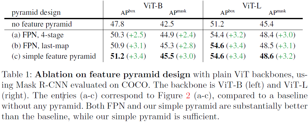 neck구조에 관한 실험이다. 기존 FPN보다 (c)의 성능이 더 좋다. 기존에 FPN이 multi-scale feature를 이용함으로써 성능이 올라가는 반면에 ViT는 single-scale 이고 어디서 떼어오든 receptive field의 차이가 없기 때문에 ViT를 Backbone으로 사용할때는 FPN이 큰 이득을 보지 못하는 것을 확인할 수 있다.