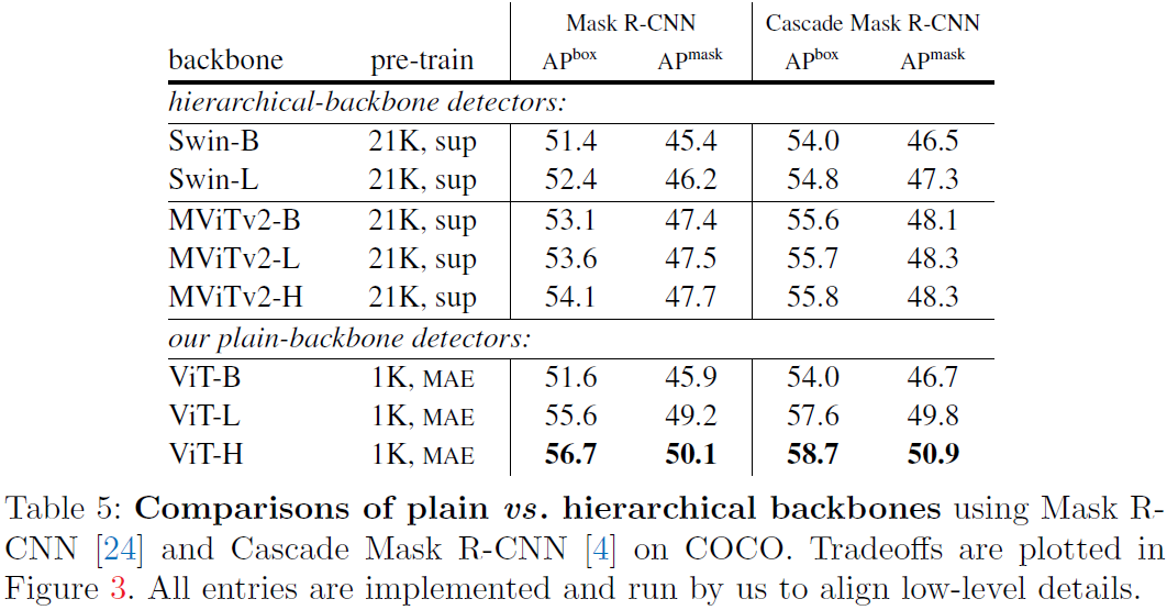 표5는 Hierarchical backbone 기반의 object detector간 성능을 비교한 표이다. 여기서, ViT의 position embedding 방법을 Swin, MViT와 마찬가지로 relative position embedding 방법을 사용하였다고한다.
