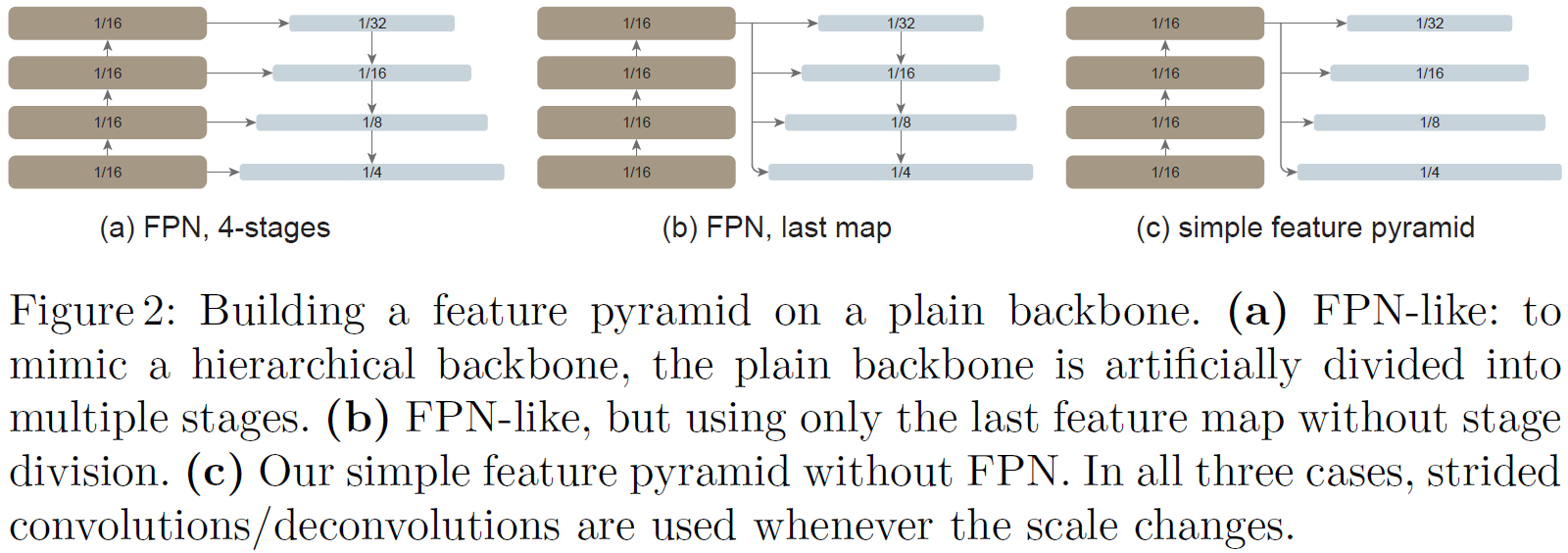 그리고, 논문에서는 어떻게 neck 부분을 plain ViT에 적절하게 설계할 수 있는가에 대해서도 탐색하려는 시도를 했다. 최종적으로는 (c) 구조를 채택했다.