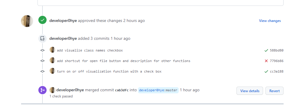 기존에도 PR이 여러번 요청됐지만, 딱히 소스코드를 수정하고 merge 할 일이 없어서 그냥 바로 master 브랜치에 merge 했다.