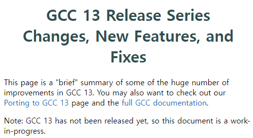 This page is a "brief" summary of some of the huge number of improvements in GCC 13. You may also want to check out our Porting to GCC 13 page and the full GCC documentation. Note: GCC 13 has not been released yet, so this document is a work-in-progress.