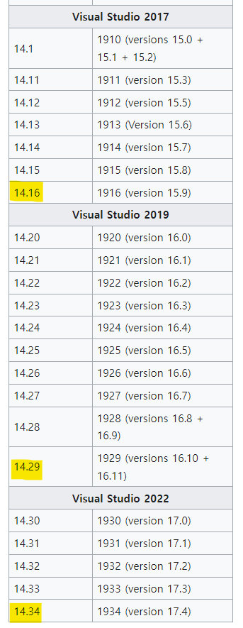 20230128 일자를 기준으로 Visual Studio 2017, 2019, 2022 별 최신 컴파일러가 설치돼있다. https://en.wikipedia.org/wiki/Microsoft_Visual_C%2B%2B Microsoft Visual C++ - Wikipedia From Wikipedia, the free encyclopedia Integrated development