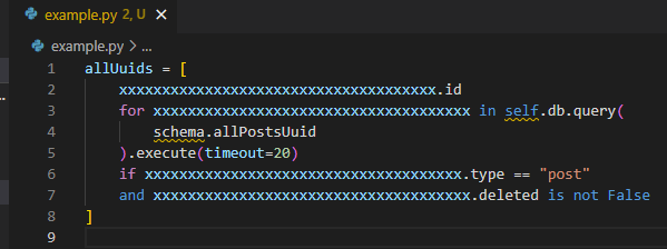 allUuids = [xxxxxxxxxxxxxxxxxxxxxxxxxxxxxxxxxxxxx.id for xxxxxxxxxxxxxxxxxxxxxxxxxxxxxxxxxxxxx in self.db.query(schema.allPostsUuid).execute(timeout = 20) if xxxxxxxxxxxxxxxxxxxxxxxxxxxxxxxxxxxxx.type == "post" and xxxxxxxxxxxxxxxxxxxxxxxxxxxxxxxxxxxxx.deleted is not False]