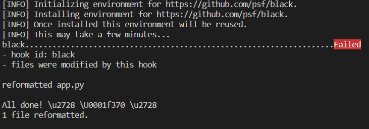 코드가 black에 의해 수정됐으니 다시 staging을 하고 commit을 해보자