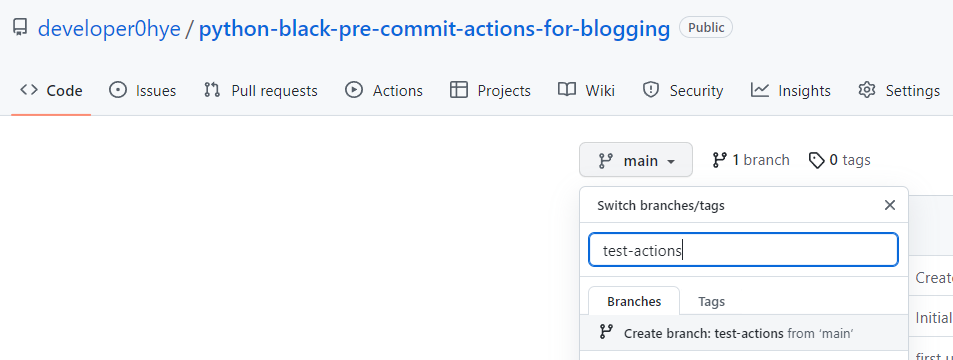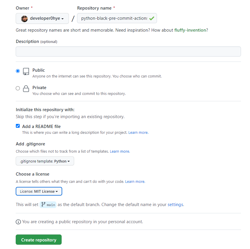 이름은 python-black-pre-commit-actions-for-blogging 으로 생성했다.