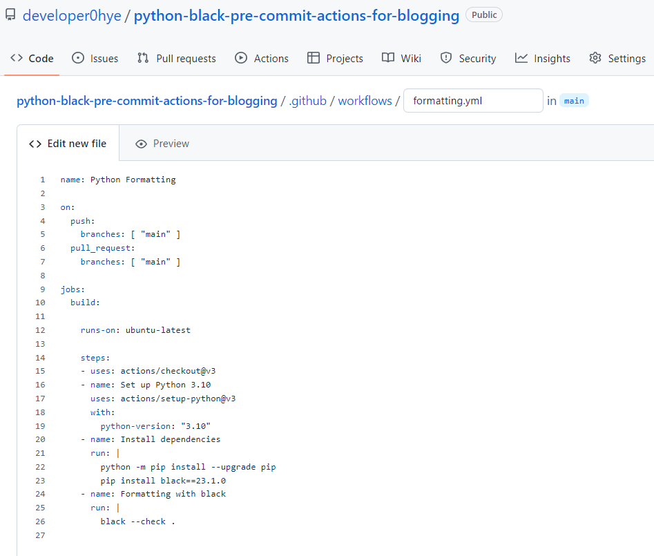rev 에 쓰인게 우리가 쓸 black 버전이고, Github Actions workflow 파일 작성할때도 이 버전이 쓰이니 기억해두자