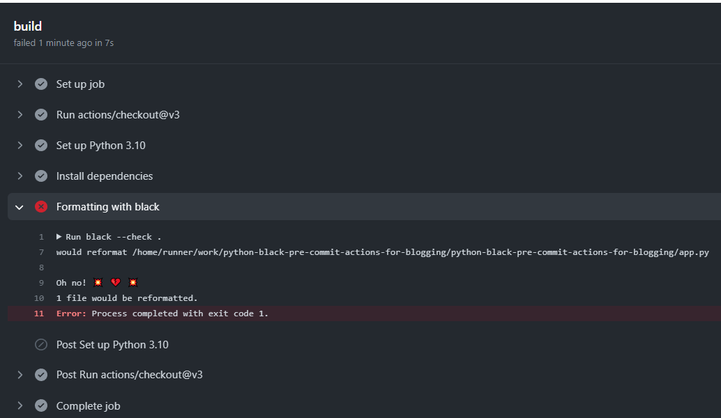 그다음 black --check . 통해 format이 black의 format과 안맞으면 실패!