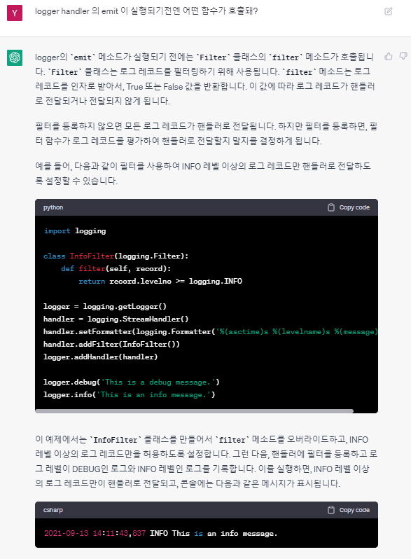 처음에는 Handler 를 손대봤는데 안된다. Handler의 emit 함수가 실행되기이전에 이미 emoji로 포함한 텍스트를 로깅하려는 과정이 어디선가 발생하면서 오류가 발생했다. 그래서, ChatGPT한테 handler 이전에 어떤 함수가 호출되냐고 물어봤더 Filter 클래스의 'filter' 함수가 먼저 호출된단다.