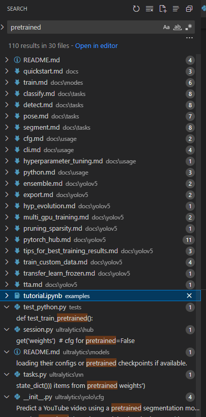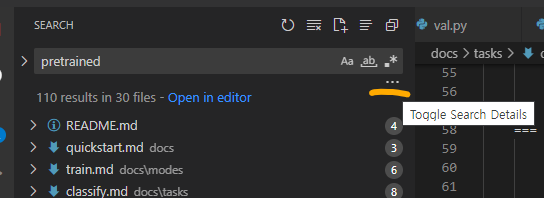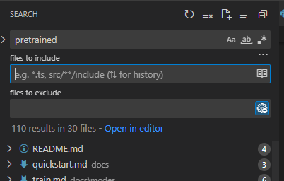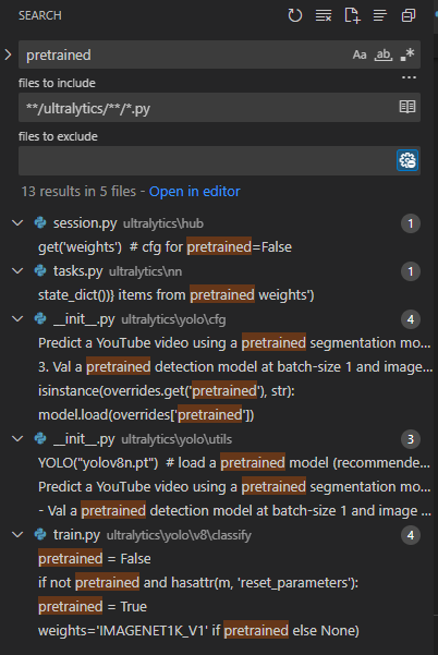 어떤 프로젝트에서 'pretrained' 라는 이름을 갖는 변수가 사용되는 부분을 보고싶었다. 이럴때, VSCODE에서 ctrl + shfit + f 로 찾으면 쉽게 찾을 수 있다.