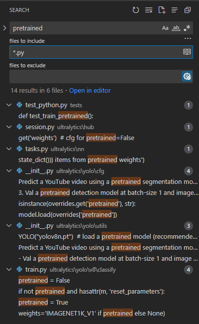 저기서 맨위에 tests 라는 폴더까지 검색한 걸 볼 수 있는데, 만약에 나는 test 폴더에 있는 건 별로 안궁금하고 ultralytics 라는 폴더에 있는 것만 검색하고 싶다 하면 glob pattern을 적절히 활용하여 적어주면된다.