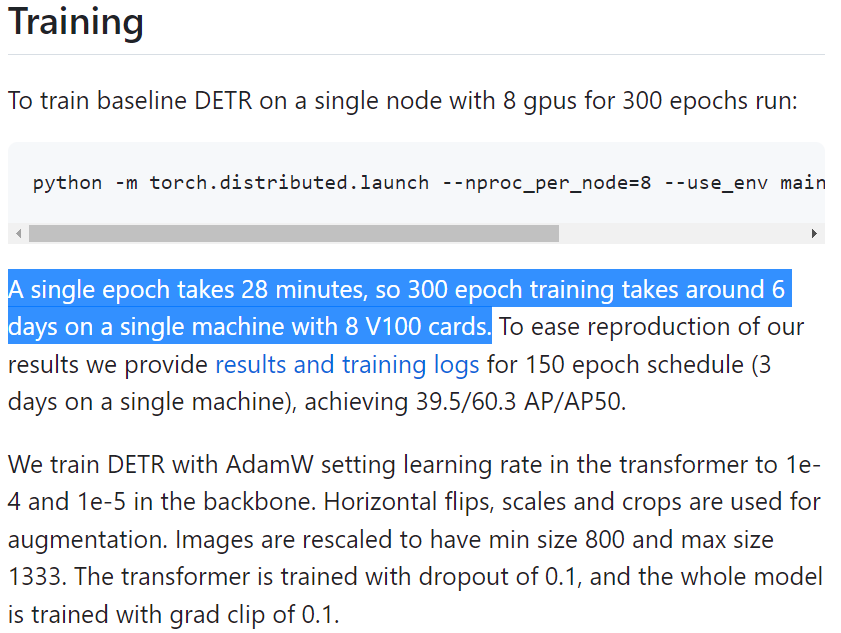 8 V100 GPUs 로 300에폭 세팅으로 6일이 소요된다니... 살벌하다...