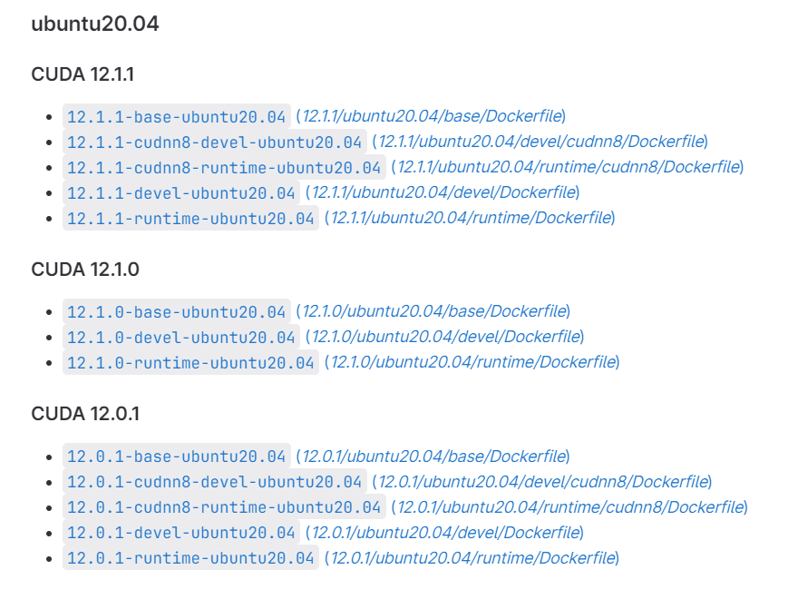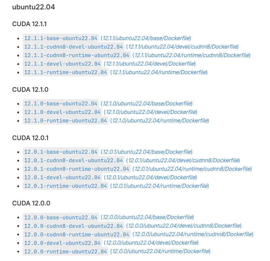 OS 별로, CUDA 별로, 그리고 cudnn 유무에 따른 이미지들의 태그가 쭉 있다.
