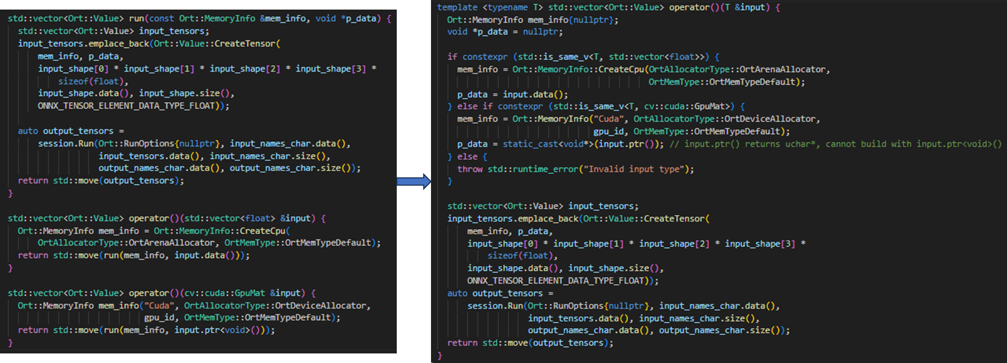 3개의 함수를 1개의 함수로 줄여버렸다. cv::cuda::GpuMat의 ptr 반환형을 void로 지정하니 constexpr 키워드와 함께 해당 블럭의 컴파일이 안되더라... 원래 그런건가? 컴파일할때 뭔가 불명확해져서 컴파일이 안되나...?? template 함수를 사용하면 안되는건가...!