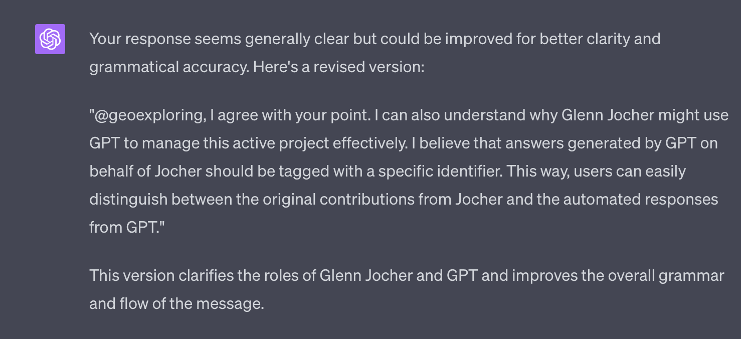 요지는 v8 메인테이너인 jocher 가 gpt로 답변을 하는 것에 있어서 gpt가 작성한 글과 jocher가 직접 작성한 글은 구분이 되어야 한다는 것이다.