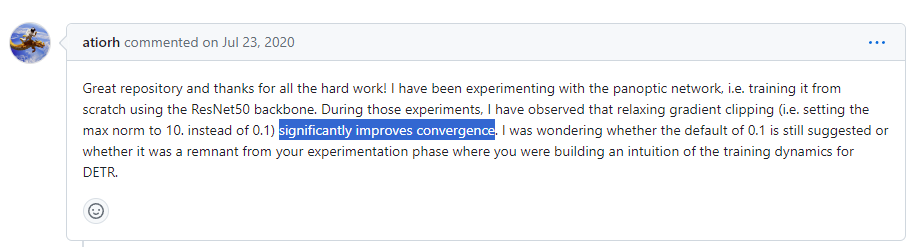 나는 DETR 갖고 실험한 것은 아니지만 내 모델(심지어 다른 Task 수행하는 모델임)갖고 여러 max_norm 값에 대해 튜닝을 해보았을때, 0.1 과 1. 은 Validation Set에 대한 성능이 그 이상의 max_norm 값을 설정했을때의 성능에 비해 굉장히 낮게 기록됐다. 그래서 한 번 구글에 DETR Gradient Clipping 을 검색해보니 역시나 관련 이슈글이 하나 있었다.