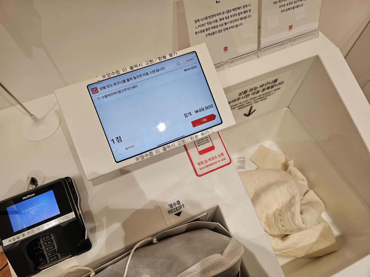 와 처음에 카메라로 하는 건가? 카메라로 하는거면 대박인데 어떻게 했지? 하면서 카메라를 찾아봤는데 카메라가 없었다! 진짜 신기하다. 해보지는 않았는데 바구니채로 옷 담아가서 넣어도 알아서 계산된다고 한다. 유니클로가면 항상 줄 서서 결제한 기억이 있는데(몇년 전) 내가 갔을때는 줄을 안서고 바로바로 결제가 가능했다. 그나저나 유니클로 옷을 직접 사는 건 정말 몇년만인 거 같다...