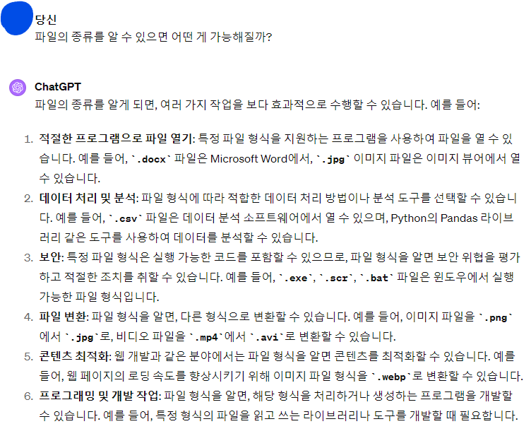 파일의 종류를 알 수 있으면 가능한 일에 대해 챗지피티는 이렇게 대답했습니다.