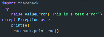 어디서 예외가 발생했는지 추적을 하기 위해서는 traceback을 import하고 traceback.print_exc()를 except 블럭에서 호출해주면 된다.