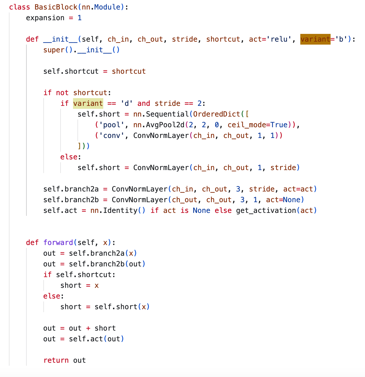 위 처럼 수정했더니 table 5와 같은 결과가 나왔다고한다. 아무튼 rt detr에서 사용된 backbone은 결국 위 논문의 ResNet-50-D를 사용한 것으로 추정된다. 코드에도 딱 Block에 variant 가 'd'인 경우에 대한 구현을 보면 그림대로 avgpooling 들어가고 1x1 conv2d 가 들어가는 걸 알 수 있다.