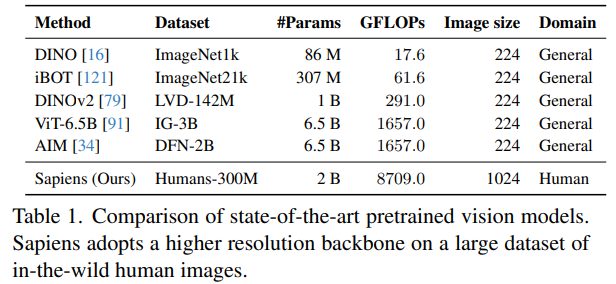 1. 특이하게도 입력 이미지 해상도가 1024(긴 변이)로 기존에 대부분의 Backbone Network가 224x224 혹은 518x518 정도로 사전 학습된반면에 Sapiens 는 비교적 큰 이미지를 인풋으로 입력받는다.