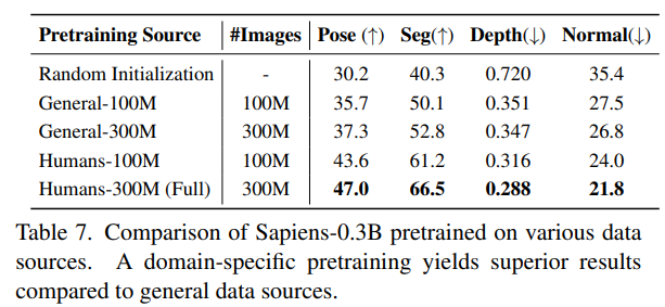 Random Initialization보다는 그래도 Human-centric하지는 않지만 General 도메인의 이미지들로 사전학습된 모델이 더 좋은 성능을 보인다. 근데 Human-centric의 고 퀄리티의 Curated Dataset을 사전학습에 사용한 경우 Human-centric Task에서 훨~씬 더 좋은 성능을 보인다!