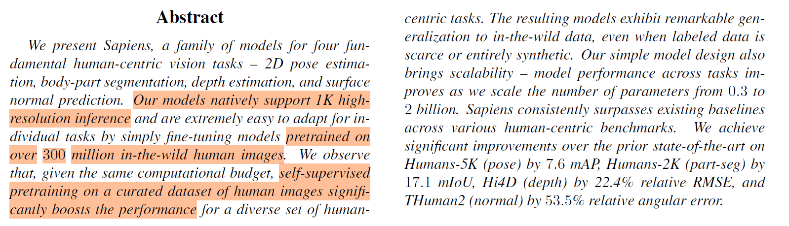 We present Sapiens, a family of models for four fundamental human-centric vision tasks - 2D pose estimation, body-part segmentation, depth estimation, and surface normal prediction. Our models natively support 1K high-resolution inference and are extremely