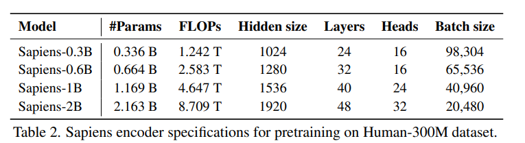 기존에 데이터셋들이 일반적인 Visual Representation Learning을 위해 다양한 이미지를 학습 데이터로 구축한 반면에 Sapiens는 정말 사람에 초점을 맞춰서 데이터를 구성했다. Table 1. 에 #Params 보면 2B라고 기재되어있는데 0.3B, 0.6B, 1B, 2B 모델이 존재한다.