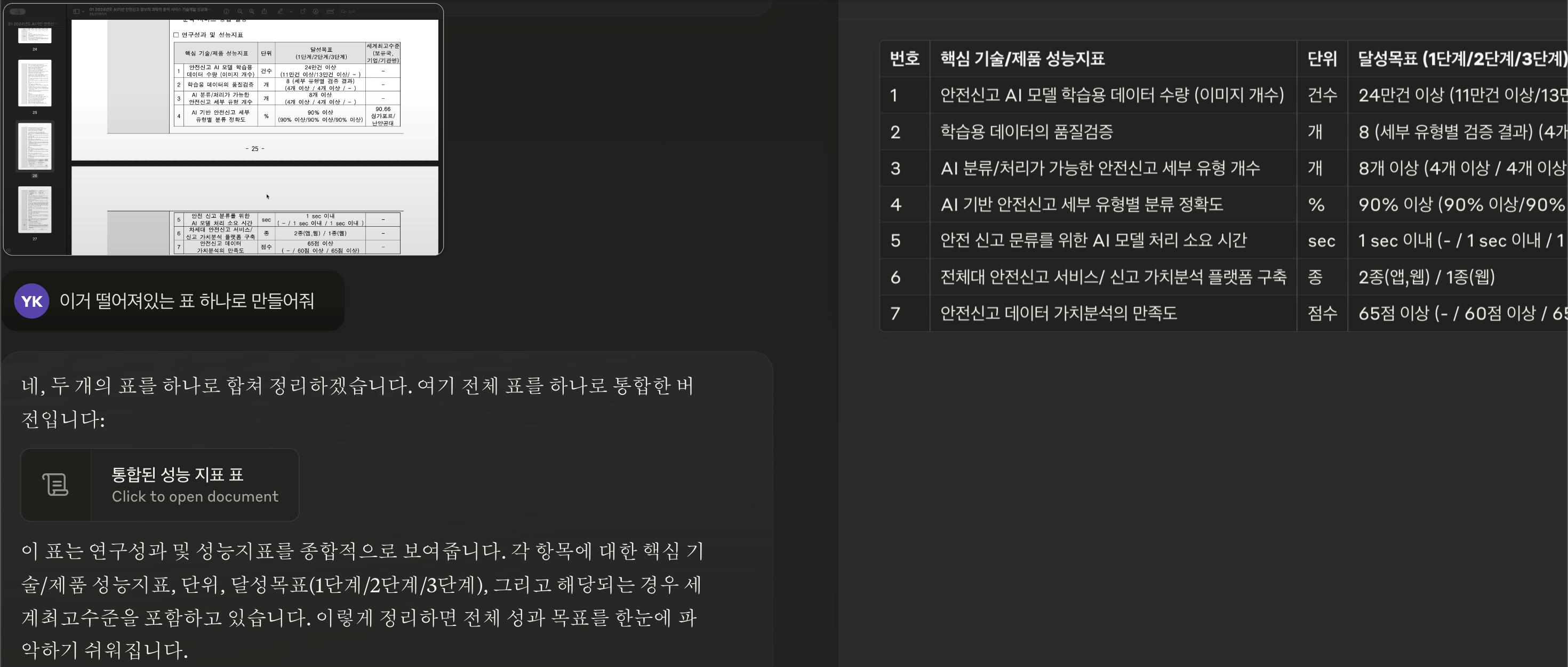 Claude sonet 에게 pdf에 존재하는 표 중 페이지가 나뉘면서 분리된 표를 하나로 만들 수 있는지 부탁해보았다.