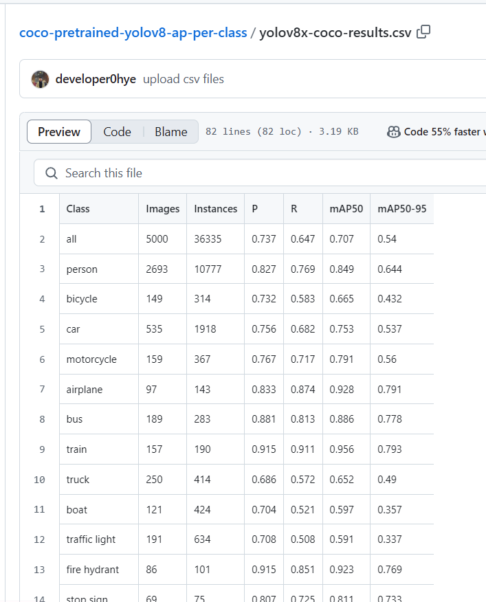 mAP만 보기엔 정보가 너무 함축돼있어서 다른 클래스에 대한 여러 메트릭 값을 csv파일로 저장하여 업로드해두었다.