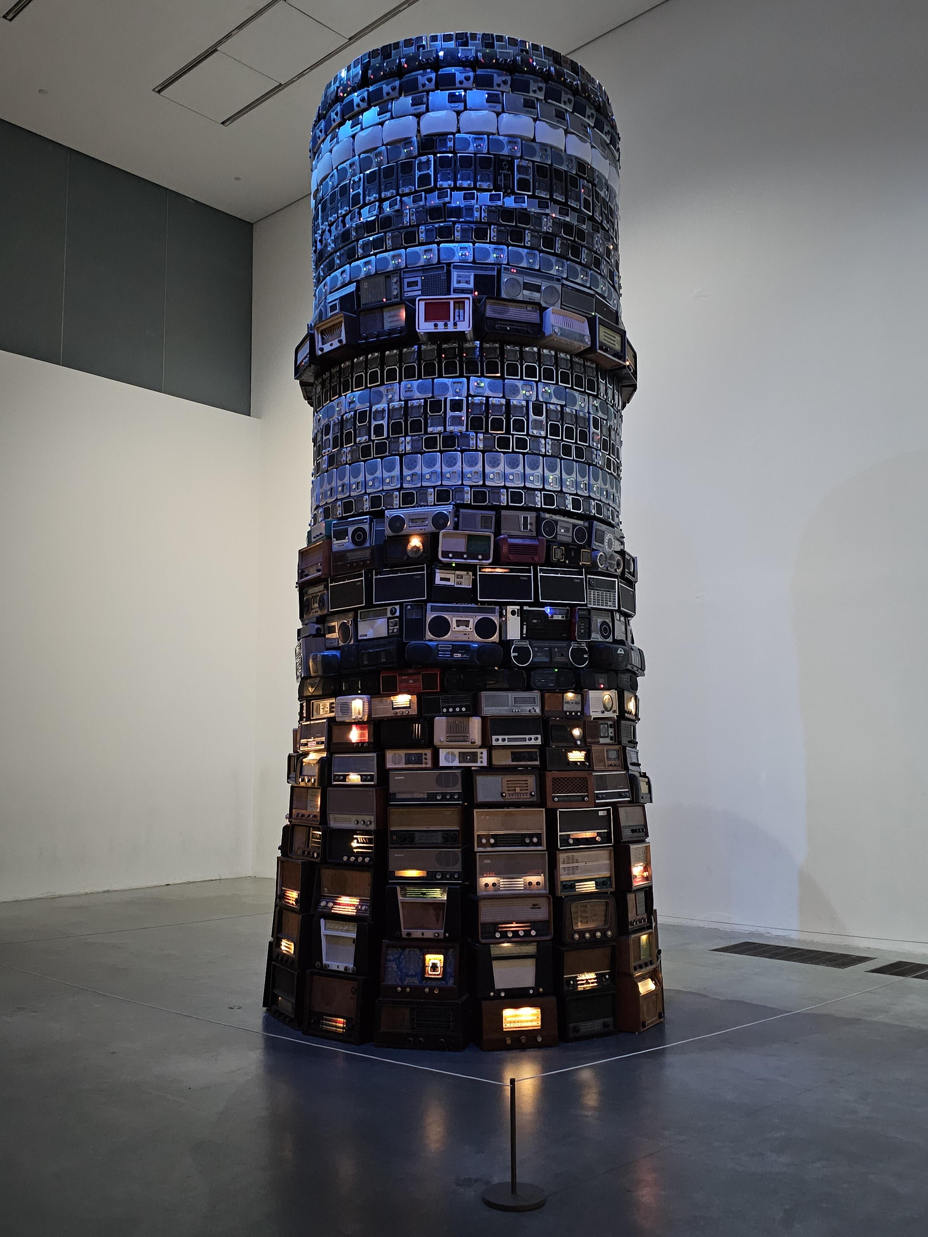 바벨탑의 저주처럼 각기 다른 언어로 방송되는 다양한 채널을 틀어 놓은 라디오로 탑을 쌓았어요. 와! 그냥 나라면 작품 설명을 "내가 힘들게 쌓아 올린 라디오 탑, 중간에 752번 무너짐, 중고 라디오 구하다가 당근 마켓에서 사기 2번 당함."이라고 했을텐데 바벨탑과 저주를 연결시켰어요. 연결을 시키니 또 한 번 정신이 혼미해져요. 스티브 잡스의 "Connecting the dots"가 떠오르는 대목입니다.