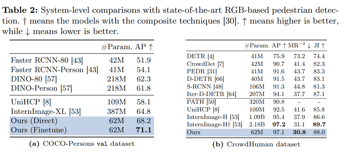 Multi-Modal 이런 키워드는 고사하고 RGB 도메인의 Human Detection 성능을 보았을때 기존 Vision Foundation Model이라 할 수 있는 InternImage 보다 훨씬 작은 모델 사이즈로 유사한 성능을 보이고 있습니다.